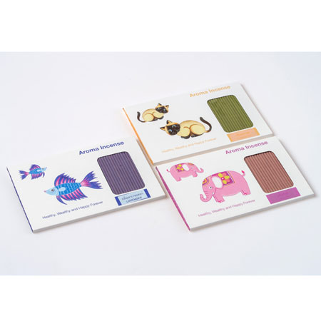 Incense and holder in folded card (elephant, cat and fish)Size: 10 x 15.3 x 0.5 CM’sWeight: 25 G.